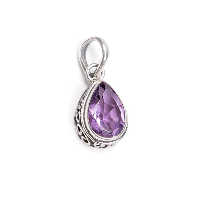 Snyggt hängsmycke med fasettslipad gnistrande ametist inramad med balinesiskt filigranmönster av sterling silver.