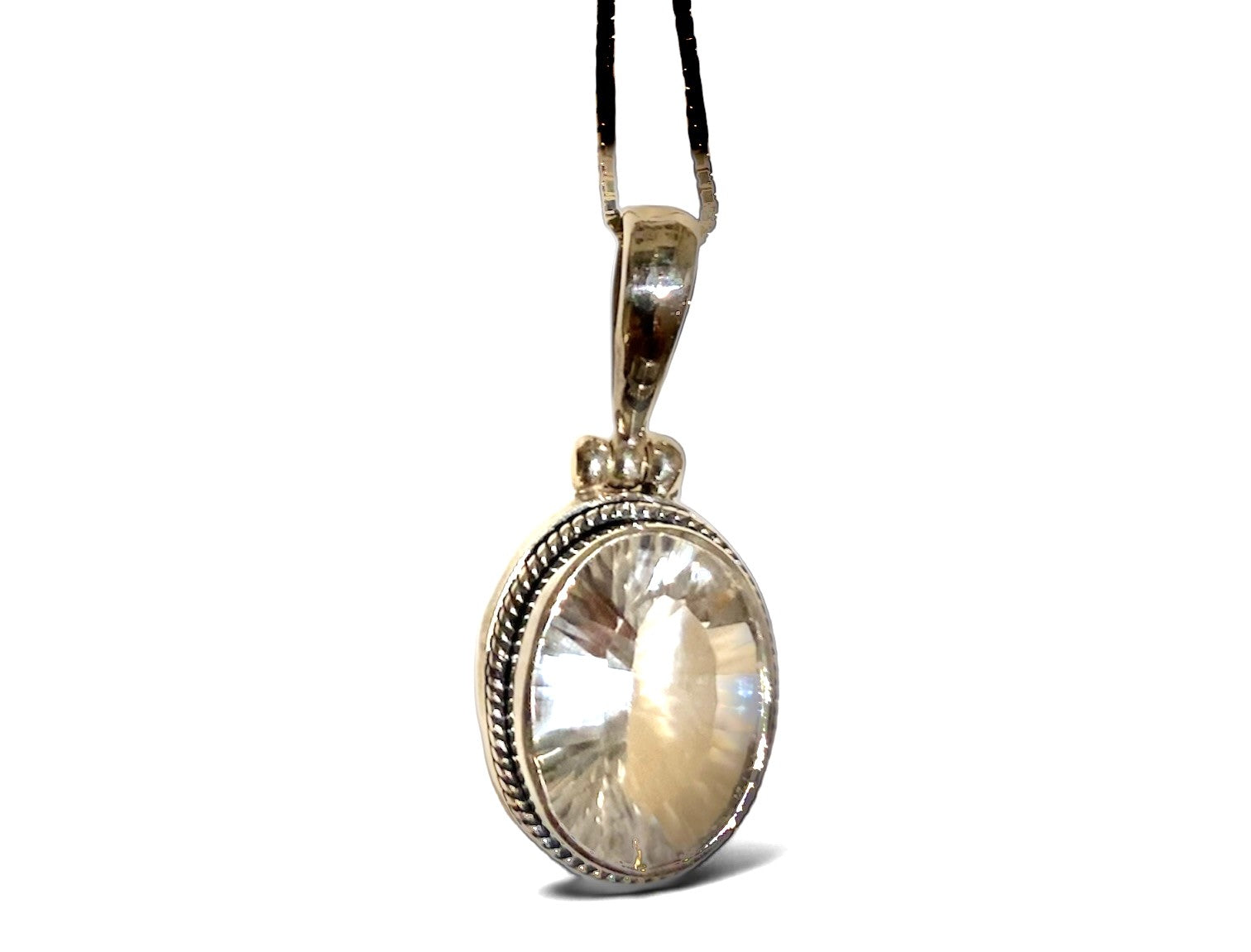 Vackert silverhänge i bergskristall fasett slipad med enkel filigrankant. Hela hänget med ögla 3 cm, bred 1,5 cm. Bara stenen höjd 1,5 cm med silverkant och bred 1,2 cm med silverkant.