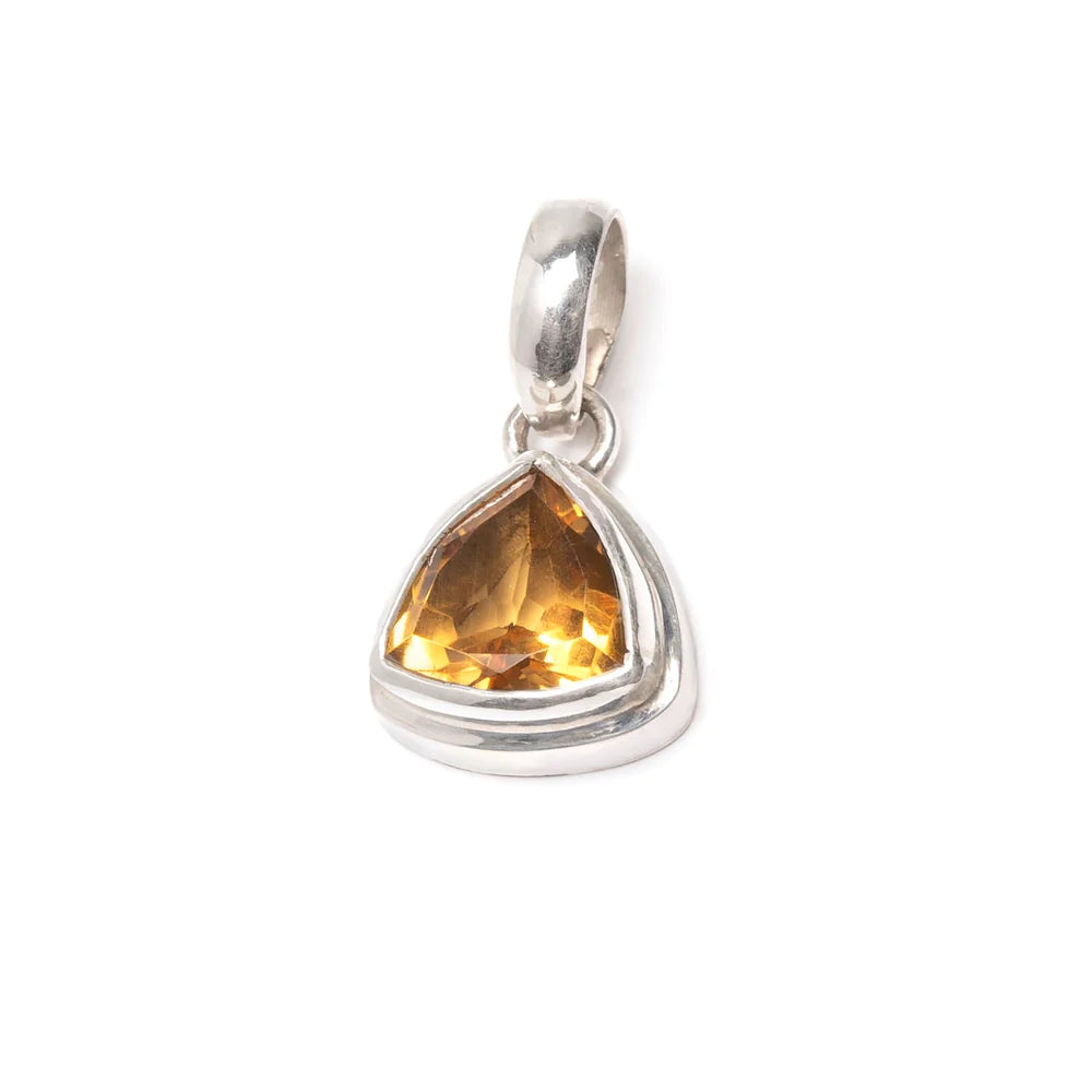 Citrin ären av de finaste exemplaren med gyllene guldgul färg. Denna sten är fasettslipad i en trekantig form med mjukt bågformade sidor och en slät infattning. Smycket är av sterling silver.