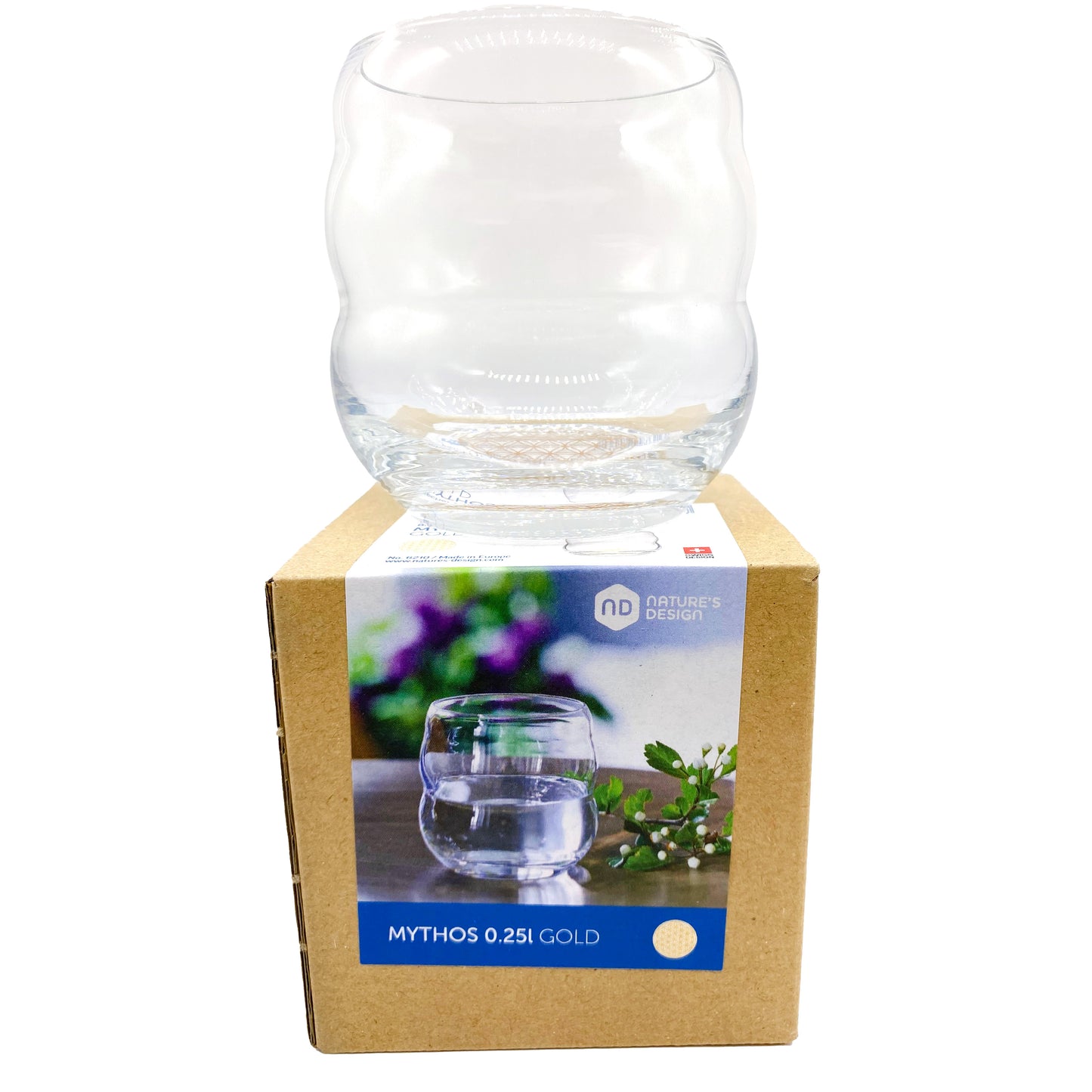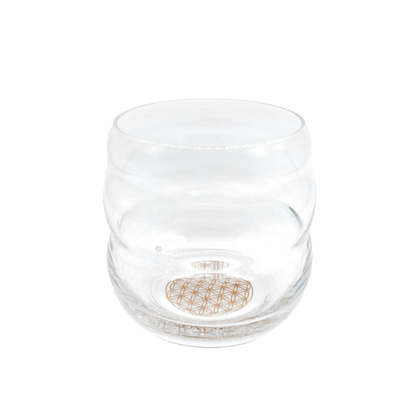 Glas med symbolen "Livets Blomma" i botten. Livets blomma är en symbol för den upplysta själen. Den perfekta harmonin i symbolen laddar innehållet i glaset med positiv energi. Tillverkad av handblåst rent kristallglas utan tungmetaller. Används enbart till kalla och ljumma drycker. Handdiskas.