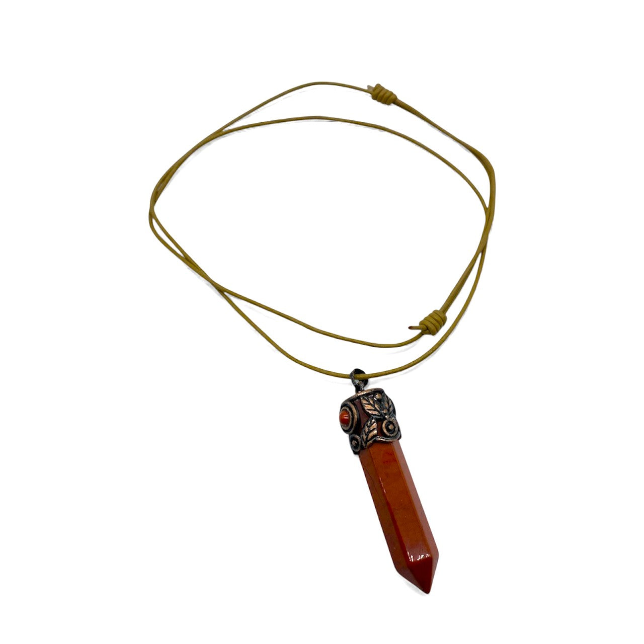 Vackert hänge i röd japis och koppar med lädersnöre.