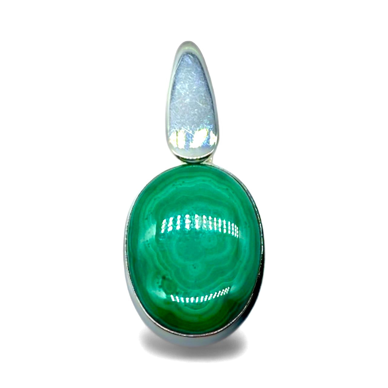 En malakit med originell ögla med en platta av silver. Stenen är cabochonslipad för att framhäva den naturligt melerade gröna färgen.